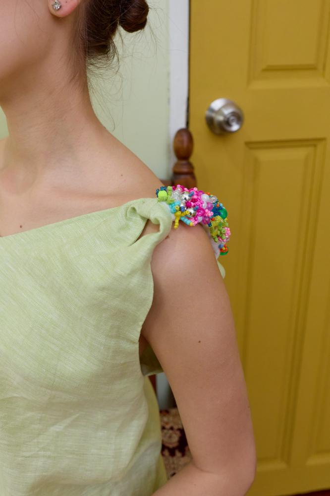 فستان لينين واسع بكتف غير متماثل وتطريز يدوي بالخرز