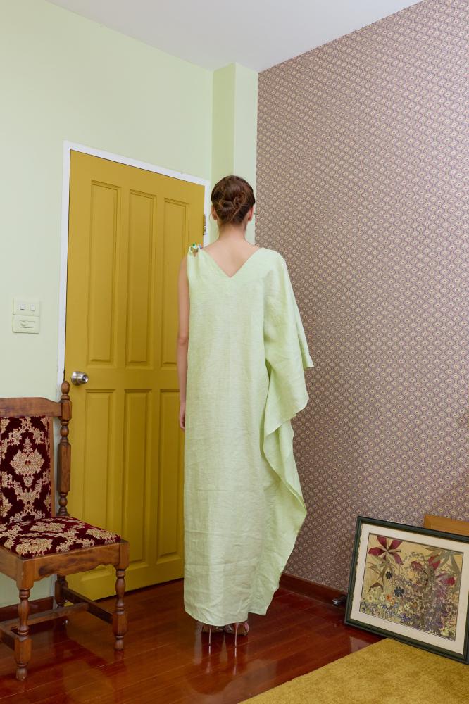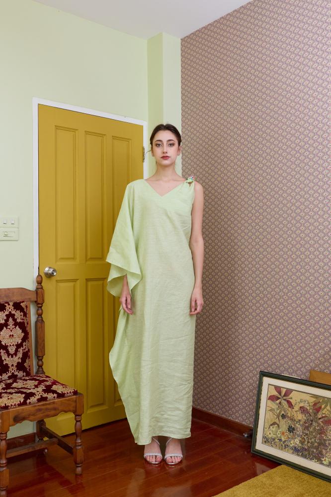 إطلالة أنيقة ومميزة بتصميم واسع وانسيابي من قماش اللينين الفاخر. يتميز الفستان بقصة غير متماثلة بكتف واحد مطرز يدويًا بالخرز الملون مع كم واسع، مما يضفي لمسة فريدة وجذابة تلفت الأنظار.