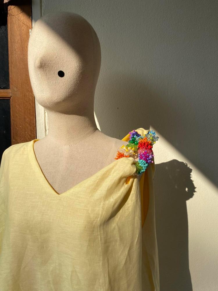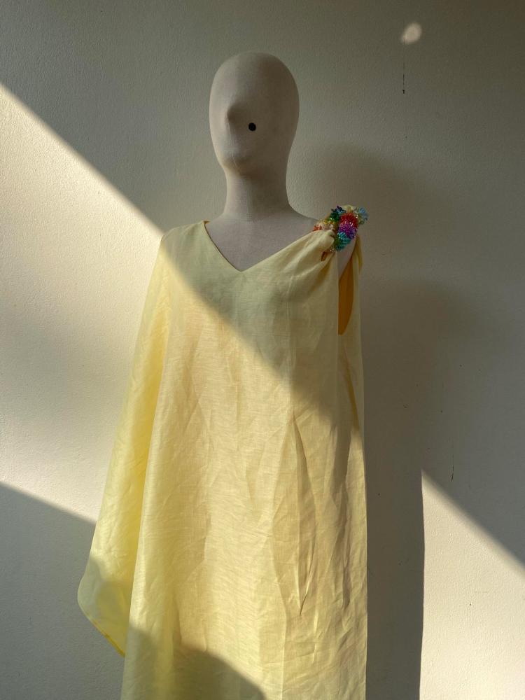 إطلالة أنيقة ومميزة بتصميم واسع وانسيابي من قماش اللينين الفاخر. يتميز الفستان بقصة غير متماثلة بكتف واحد مطرز يدويًا بالخرز الملون مع كم واسع ، مما يضفي لمسة فريدة وجذابة تلفت الأنظار.