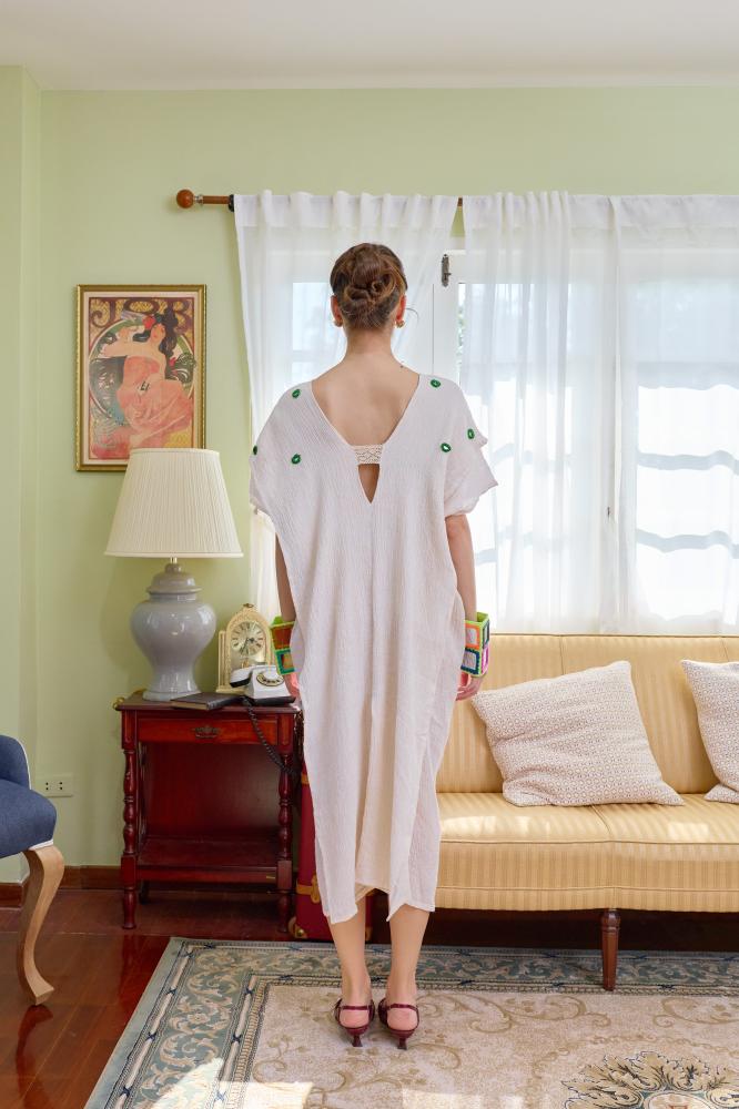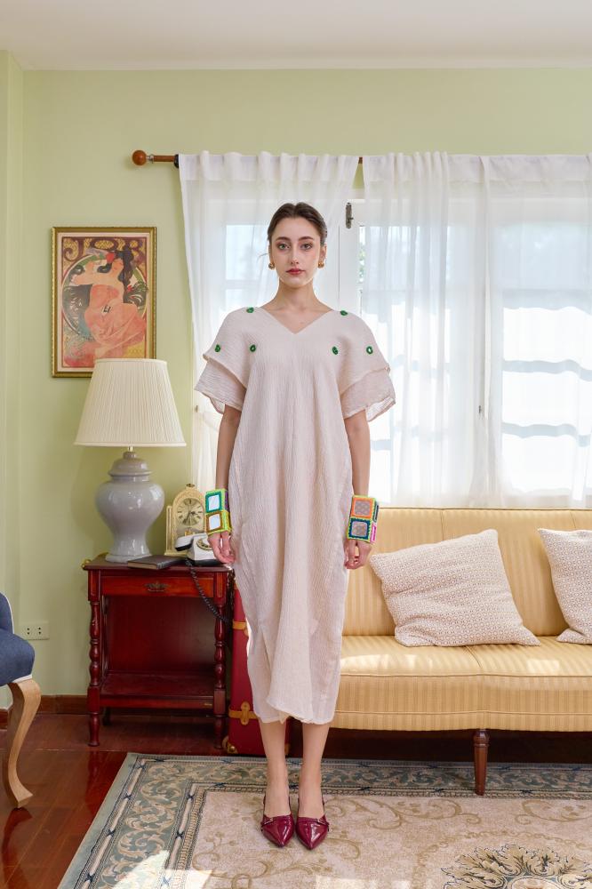 استمتعي بإطلالة صيفية مريحة مع هذا الفستان المصنوع من قماش اللينن الخفيف والمريح، بتصميم واسع وانسيابي يناسب الأجواء الدافئة. يتميز بتطريز يدوي بالمرايات الدائرية التي تضيف لمسة من التألق، مع إكسسوار لليد مطرز بالمرايات لمظهر متكامل.